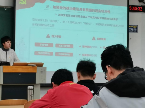 首先,曾老师以习近平总书记带领中共中央政治局常委前往上海中共一大会址和浙江嘉兴南湖红船重温入党誓词的视频开篇,引导同学们树立正确的入党动机,让同学们体会到党史学习教育的重要性。随后,曾老师通过旗帜鲜明讲政治是马克思主义政党的根本要求、注重党的政治建设是我们党的优良传统和历史经验、加强党的政治建设具有很强的现实针对性三个方面,结合古田会议、八七会议等重大会议强调了加强党的政治建设的重要性和必要性,并结合四大危险、四大考验使同学们认识到了加强党的政治建设是全面从严治党向纵深发展的内在要求,是坚持和加强党的全面领导的必然要求。