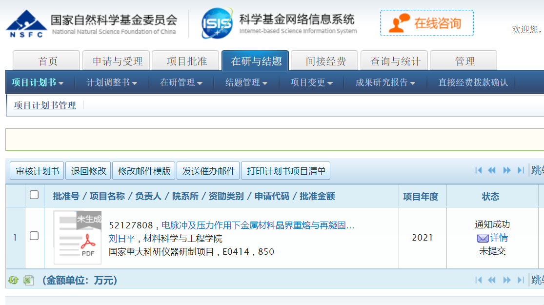刘日平教授主持申报的国家重大科研仪器研制项目“电脉冲及压力作用下金属材料晶界重熔与再凝固装置”正式获得国家自然科学基金委员会立项资助,项目直接经费850万元。这是我校首次获批主持国家自然科学基金国家重大科研仪器研制项目,是学校取得的又一项重大科研历史性突破。