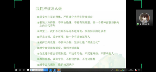 活动开始,团支书总结上次团日活动,安排下次团日活动人员布置。主持人承接话题,从礼仪角度明确了大学生的日常生活规范,并且列举了大学中常见的不文明现象,警示同学们注意规范日常行为。最后同学们一起观看了2020世界环境日主题宣传片,感悟环境保护的重要意义。
