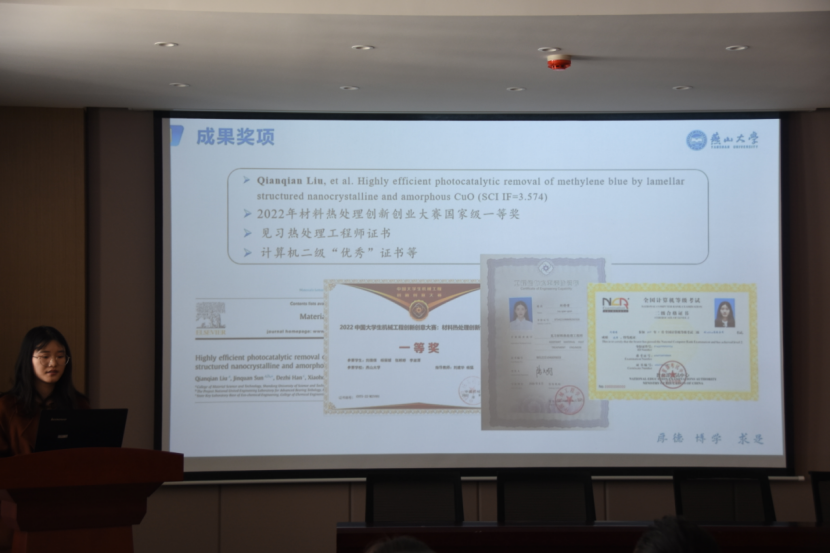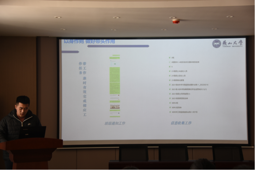 会议伊始,由主持人对本次评选会的流程和标准进行了详细介绍。随后,8名参评同学通过PPT展示分享了自己的思想、学习、工作、生活和所获荣誉情况,体现了材料学子良好的精神风貌和综合素质。3个优秀班级围绕组织建设、学风建设、科创竞赛、志愿服务、班级风采及所获荣誉等向全体评委进行了汇报,精彩的图片、详实的数据不仅体现了班级建设的成果,更是体现了班级的强大凝聚力和班级成员的青春风采。个人与班级的展示得到了在场评委的一致肯定。