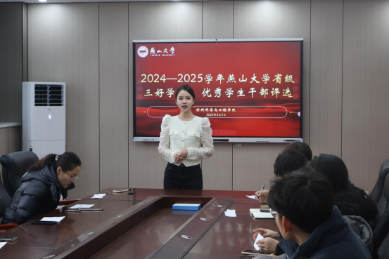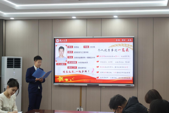 姜明金首先对本次评选条件、评选程序及评选办法进行了详细介绍。6名参评省优个人评选的学生依次通过PPT展示的方式,分享了他们在思想引领、专业学习、文体活动、创新创业、社会实践以及志愿服务等多方面的卓越成就与深刻感悟。他们是目标坚定、矢志不渝的追梦人,也是热心公益、无私奉献的志愿者。他们或在各类竞赛中摘金夺银,或在创新创业道路上勇立潮头。经过公开、公平、公正的评选,最终拟推荐2023级硕研1班硕士研究生遇世程、2022级材料物理1班本科生周宸弘、2022级硕研1班和2021级热处理1班等个人和集体参评学校省优评选的进一步角逐。