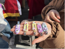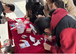 在随后的“手作制品,传递祝福”环节,同学们手工DIY制作石膏娃娃、奶油胶发夹、拼装积木等创意作品。完成作品后,同学们围坐一圈,互相展示并分享着创作背后的故事与灵感来源。有的讲述着如何将个人喜好融入设计之中,有的则分享了克服制作难题的喜悦,这些经历不仅加深了彼此间的了解。