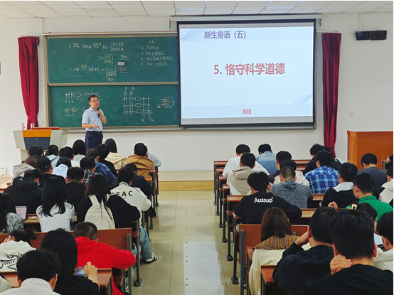赵元春告诉同学们,要从本科生向研究生身份转变,善于利用科研平台,主动探索科研世界,为同学们勾勒出课程学习、课题研究、学术交流三位一体的成长蓝图。他告诉同学们,理想的导学关系是双向尊重、教学相长,他深情寄语新生,科研工作者需时刻铭记“团结、诚信、感恩、责任”,将科学家精神深深融入科研实践之中,严守学术规范,以严谨的态度和不懈的努力,勇攀科学之巅。