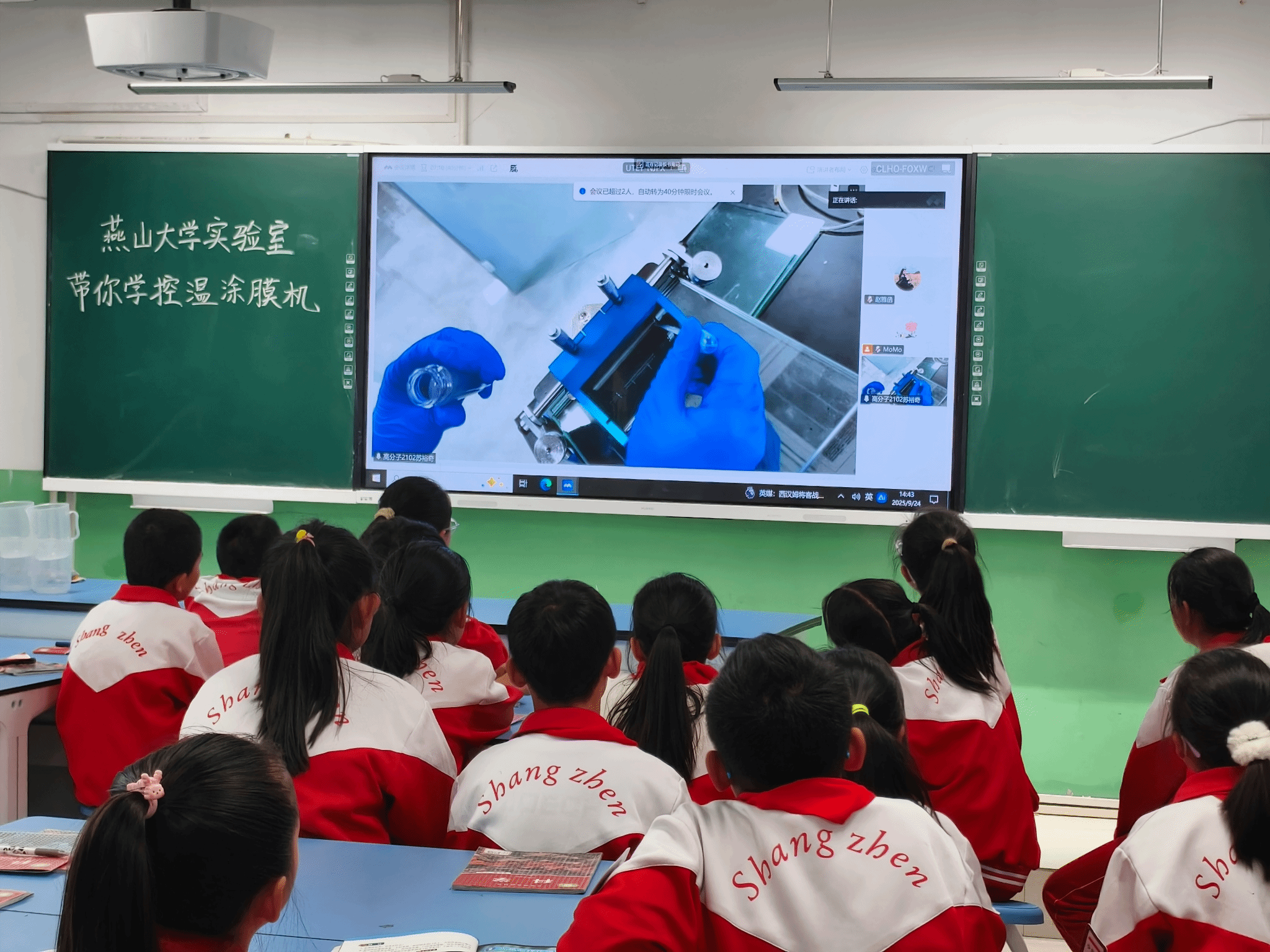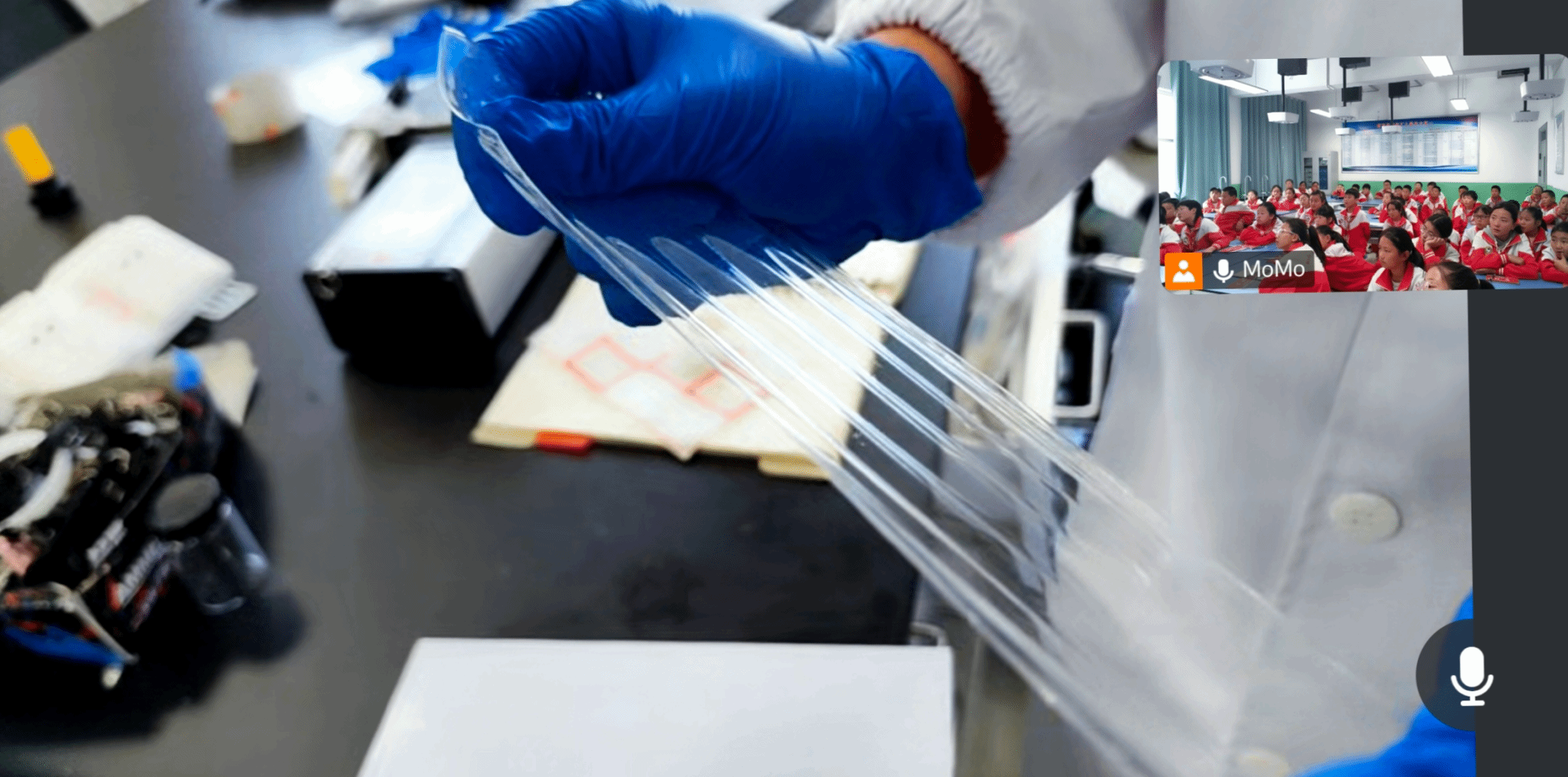 2025 级硕研 1 班的蒋珂原则带学生“走进”课题组的铺膜实验:从聚氨酯 DMF 溶液的原料介绍,到双层玻璃板的铺设逻辑,再到 70℃控温、刮刀调节、涂布操作的分步讲解,每一个细节都紧紧吸引着学生。当他拿出提前制备的薄膜样品,关联到学生日常使用的手机保护膜、包装袋时,孩子们恍然大悟,纷纷举手分享“原来我的书包夹层也是这样做的!”“妈妈的化妆品包装也是薄膜”。主动互动的热情与此起彼伏的掌声,让“云端课堂”充满线下课堂的鲜活感,不少学生还主动请求“再看一遍涂布过程”。