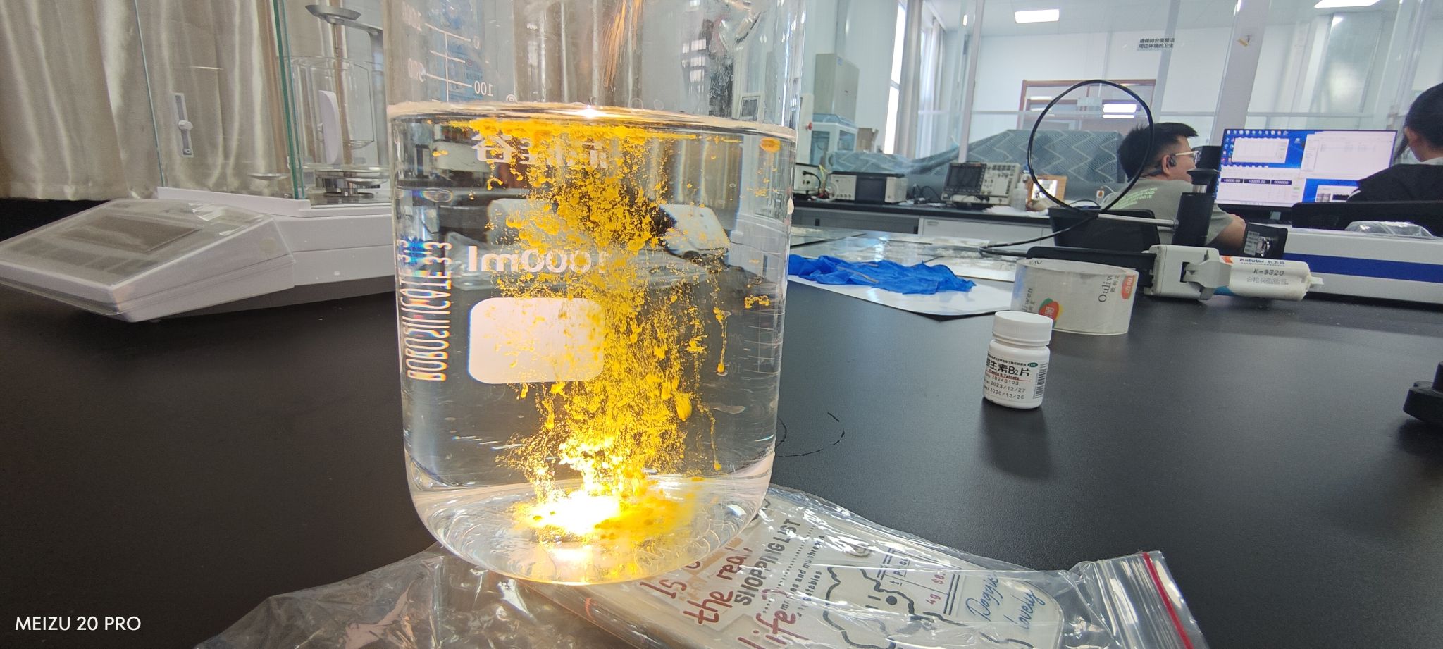 2024 级硕研 1 班武美君,以“维生素 B2 的双重奥秘”掀起课堂高潮。她先解析核黄素的荧光特性:当核黄素粉末缓缓倒入水中,灯光下因摩擦、惯性及表面张力作用形成的“荧光流星雨”瞬间绽放,黄绿色的荧光在屏幕上流转,学生们兴奋地凑到镜头前观察,甚至互相分享“我看到光点在动!”,现场掌声持续数秒。随后,武美君科普核黄素对人体代谢的重要性,并补充 TPU 薄膜拉伸机原理,学生们听得格外专注,不少人认真记录下“水溶性维生素”“力学测试”等关键词,展现出强烈的求知欲。