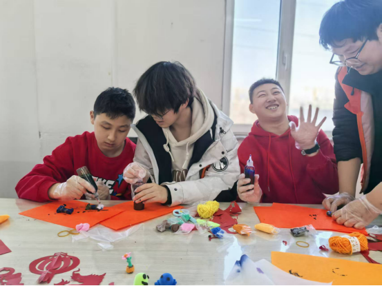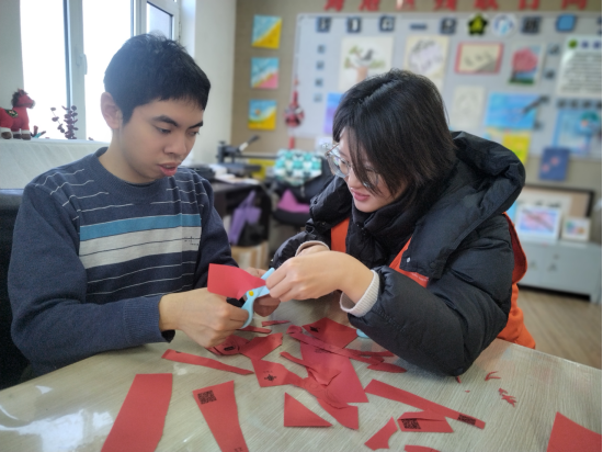 面对部分孩子初期的拘谨与沉默,志愿者们俯下身来,用温和的语言引导、鼓励的眼神支持,一点一滴拉近距离。渐渐地,孩子们开始尝试表达、动手创作——揉出可爱的雪人,缠绕出五彩“阳光”,剪出充满童趣的窗花。每一件作品都是他们内心世界的温柔流露,也见证了情感联结的悄然建立。