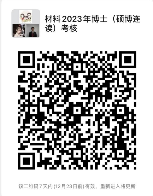 学院将于2022年12月26日至30日对硕博连读考生采用远程方式进行考核,对考生申请材料、专业外语能力、专业基础、综合素质等方面进行考核,面试总分为100分,低于60分为考核不合格。请报考考生加入微信群“材料2023博士(硕博连读)考核”,综合考核安排及相关正式材料提交时间另行通知。